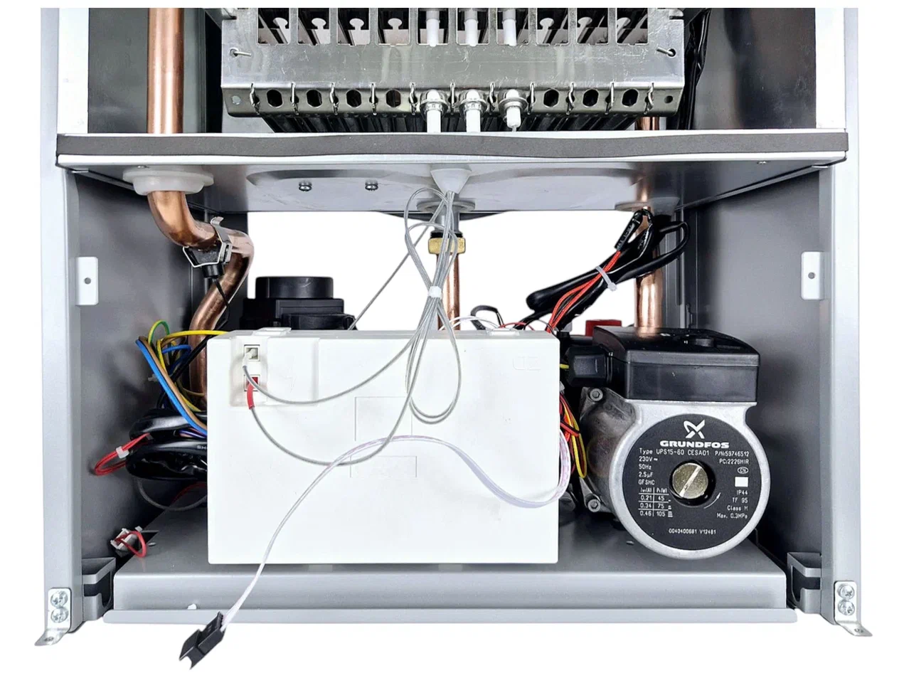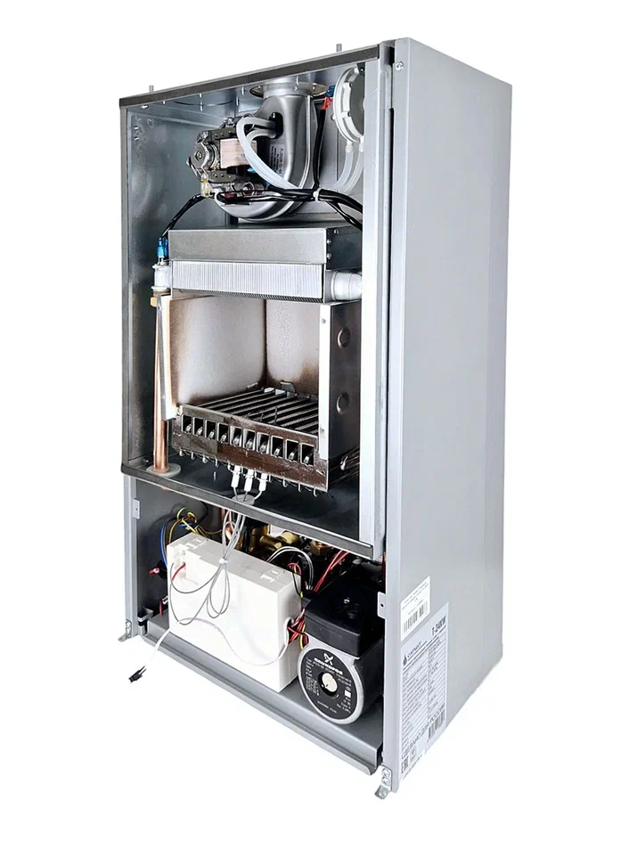 Котлы укоплектованы всеми необходимыми элементами: расширительным баком, насосом и группой безопасности. Котлы разработаны с использованием современных технологий и изготовлены специально для российских условий эксплуатации. В котлах используются надежные циркуляционные насосы с трехступенчатым переключением мощности, латунная гидрогруппа. Для безопасной работы котла предусмотрено 13 ступеней защиты. Котел T-24 ONE - одкоконтурный прибор индивидуального отопления с функцией подключения бойлера косвенного нагрева тепловой мощностью от 24 до 50 Квт. Имеется встроенная функция управления через Wi-Fi.