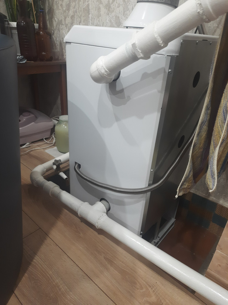 Такое боковое расположение подводки к системе отопления полностью идентично устаревшей модели котла АОГВ-17.4-3, а именно диаметр каждого патрубка для системы отопления равен 1 1/2" (ДУ 40) с межосевым расстояние между входной и выходной трубой к системе отопления в 540 мм, при высоте от пола и до середины нижней отопительной трубы в 269 мм. Все это говорит о том, что вам не нужно переделывать систему отопления и проект при замене на новый котел RGA-17 исп.7. Дымоходное отверстие на котле так же как и в старой модели накрывается зондом, диаметр которого на дымовую трубу не менее 125 мм, что так же аналогично котлу АОГВ 17.4.