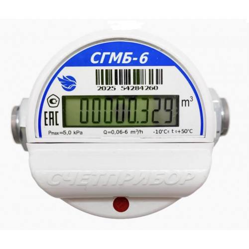 СГМБ-6 "Счетприбор" с батарейным отсеком предназначен для точного измерения и объема контроля потребляемого количества природного газа по ГОСТ 5542-87 или паров сжиженного углеводородного газа по ГОСТ 20448-90, используемых в бытовых и производственных целях. Данный бытовой счетчик газа предназначен для использования в доме, в квартире, для газовых плит и котлов. Счетчик состоит из: струйного автогенератора, заключенного в герметичный корпус с присоединительными патрубками; электронного блока; литиевой батареи для электропитания; крышки корпуса с пломбировочным кольцом. Компактность прибора обусловлена использованием струйного метода, позволяет сделать прибор с небольшими габаритными размерами. Отсутствие движущихся механических частей и высокая надежность ввиду этого, так же обусловлено выбранным струйным методом учета объема потребления газа. Простота монтажа (не требует газосварочных работ). Монтаж счетчика для газа можно произвести в любом удобном для клиента положении, в вертикальном или горизонтальном. Газовый счетчик оснащен электронным дисплеем. При помощи энергонезависимой памяти счётчики сохраняют информацию о потреблении газа даже при отсутствии электропитания, благодаря встроенной батарее (сменной). Технические характеристики: Производитель Счетприбор, Россия;