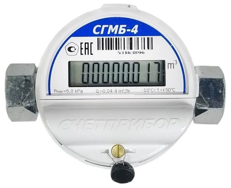 Счетчик бытовой СГМБ-4 производства ЗАО Счетприбор с возможностью замены элемента питания (батареи) без снятия самого счетчика, благодаря вынесенному батарейному отсеку на лицевую сторону счетчика и дополнительно опломбированному для защиты. Процедуру вскрытия пломбы и замены батареи праве производить специализированные монтажные организации занимающиеся организацией работ по газу. СГМБ-4 предназначен для измерения проходящего через него объема газа косвенным методом измерения по средствам измерения частоты и количества автоколебаний, создаваемых струйным автогенератором, пропорциональных расходу и объему газа, прошедшего через счетчик. (природного газа по ГОСТ 5542-87, сжиженного газа по ГОСТ 20448-90 и других газов, не агрессивных к материалам счетчика).