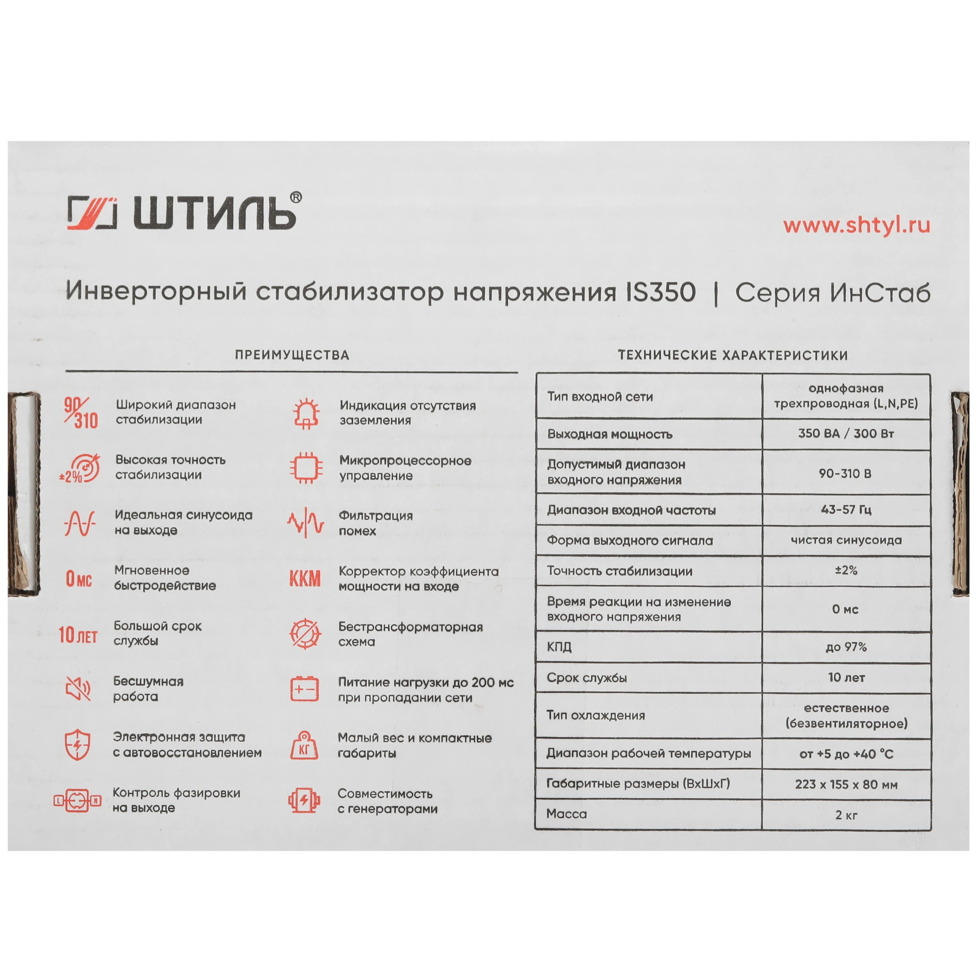 Инверторный однофазный стабилизатор Штиль ИнСтаб IS350 220 В 350 ВА позволяет защищать бытовые приборы от перепадов напряжения в электросети. Модель обеспечивает высокую точность стабилизации, погрешность составляет всего 2%. Аппарат изготавливается по инверторной технологии и обладает превосходными характеристиками, при небольших размерах и весе. На передней панели имеются световые индикаторы для визуального контроля рабочих показателей. Стабилизатор активно используется в офисе, в загородном доме или медицинских учреждениях.